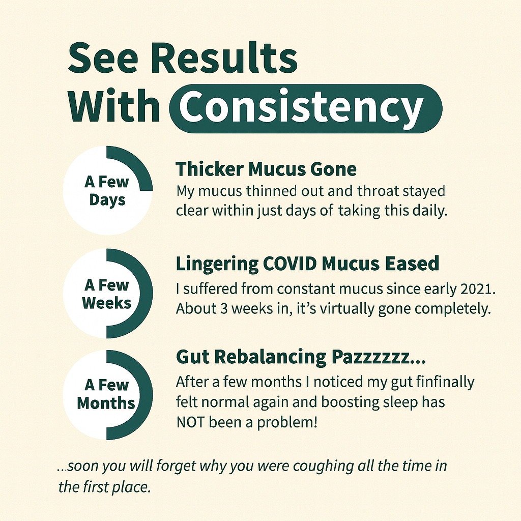 JenniferVerified Buyerthis is a lifesaverIf you have long-term mucus after being sick… get this. I’ve been dealing with mucus and bloating ever since getting sick last winter.This is the only thing that helped. I noticed less throat clearing after a few days, and now my stomach feels lighter and my sinuses don’t flare up as bad. Feels like my whole system reset.